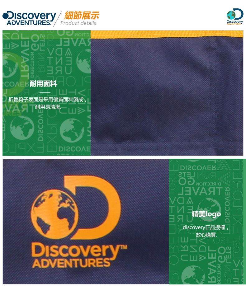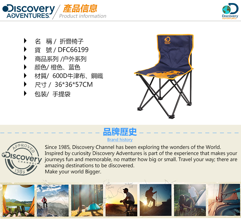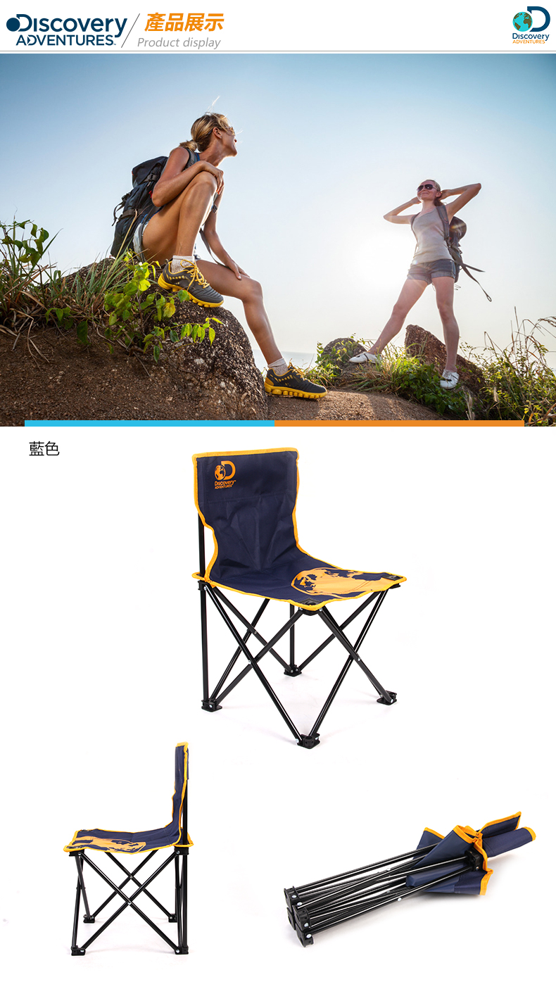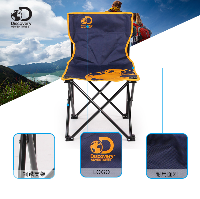 - 品名:折疊椅子 - 品牌:DISCOVERY ADVENTURES - 貨號:DFC66199 - 商品系列:戶外系列 - 顏色:橙色/藍色 - 材質:600D牛津布,鋼鐵 - 尺寸:36*57*57CM - 包裝:DA手提袋