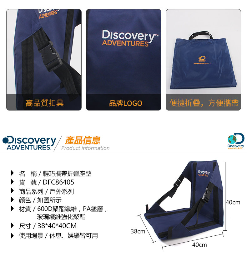 - 品名:輕巧便攜折疊坐墊 - 品牌:Discovery Adventures - 貨號:DFC86405 - 商品系列:戶外系列 - 顏色:藍色 - 材質:600D聚酯纖維,PA塗層,玻璃纖維強化聚酯 - 尺寸:38*40*40 CM - 適用場合:休憩,露營使用