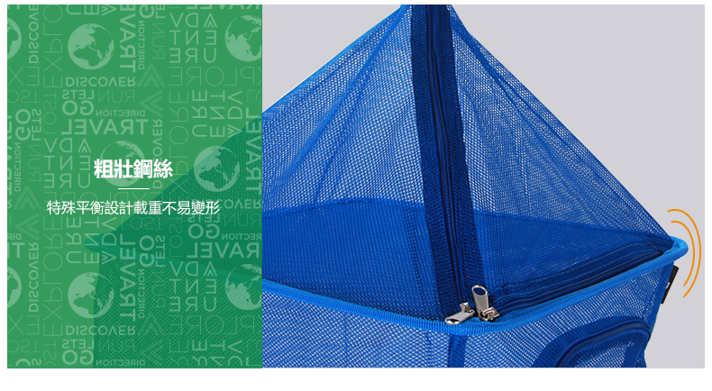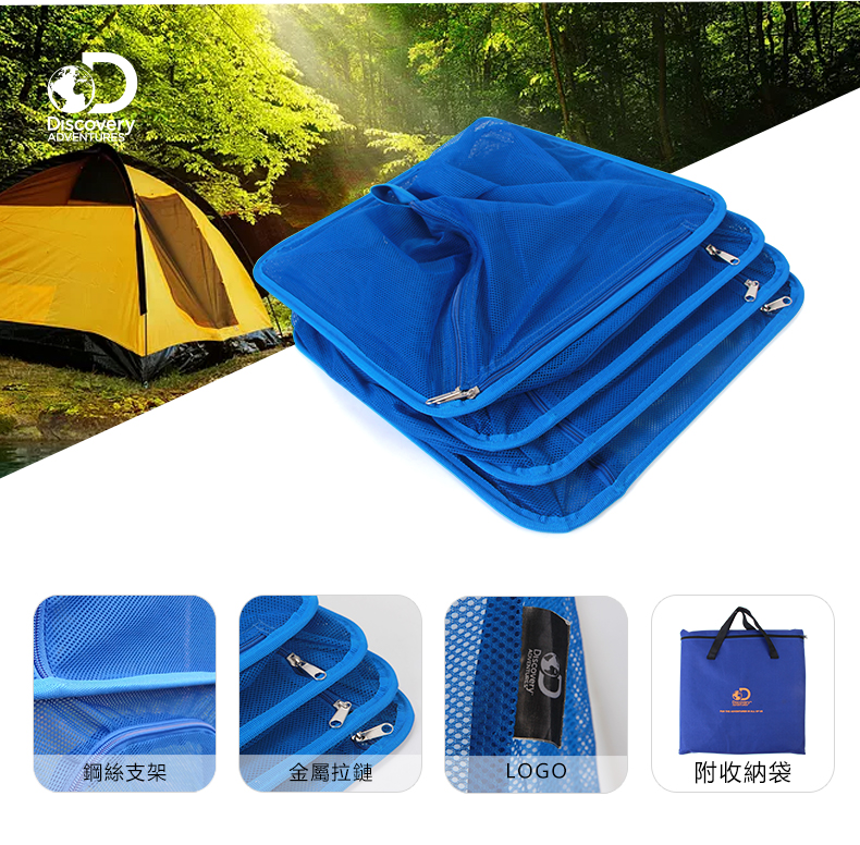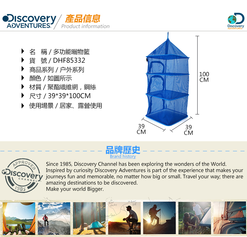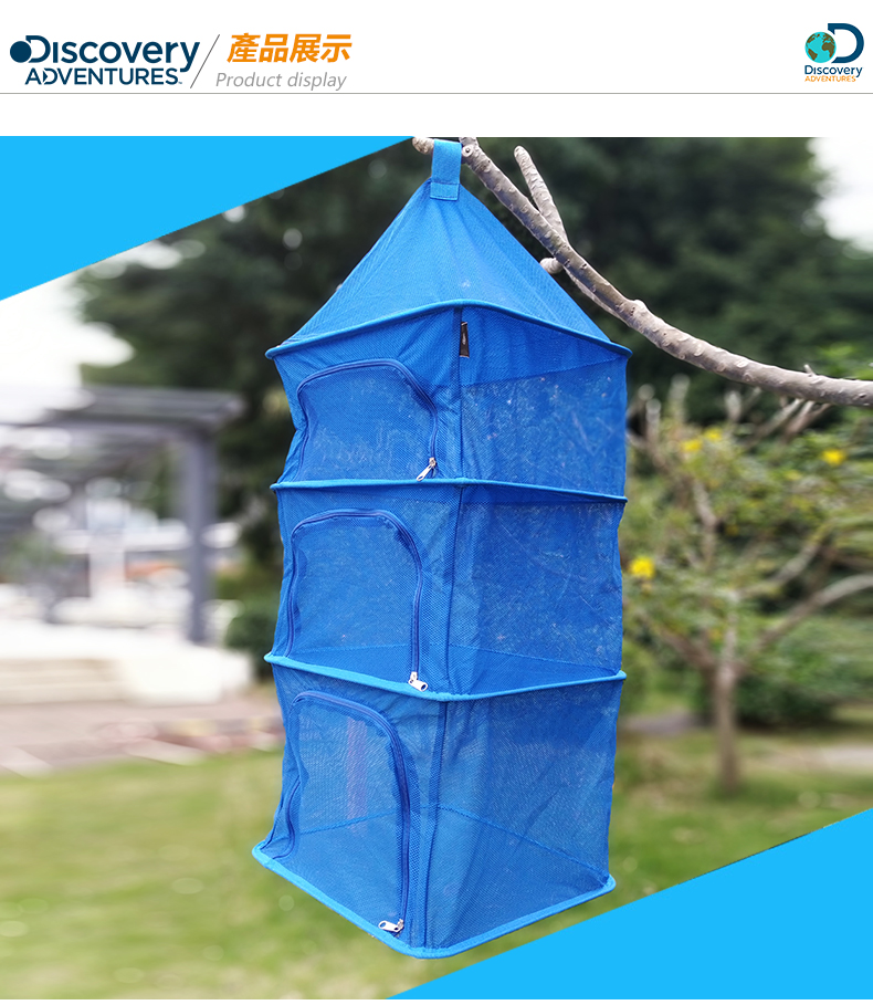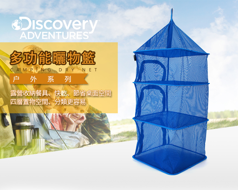 - 品名:多功能曬物籃 - 品牌:Discovery Adventures - 貨號:DHF85332 - 商品系列:戶外系列 - 顏色:藍色 - 材質:聚酯纖維網,鋼絲 - 尺寸:39*39*100 CM - 適用場合:露營,居家..皆可使用