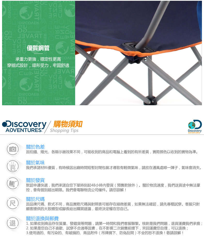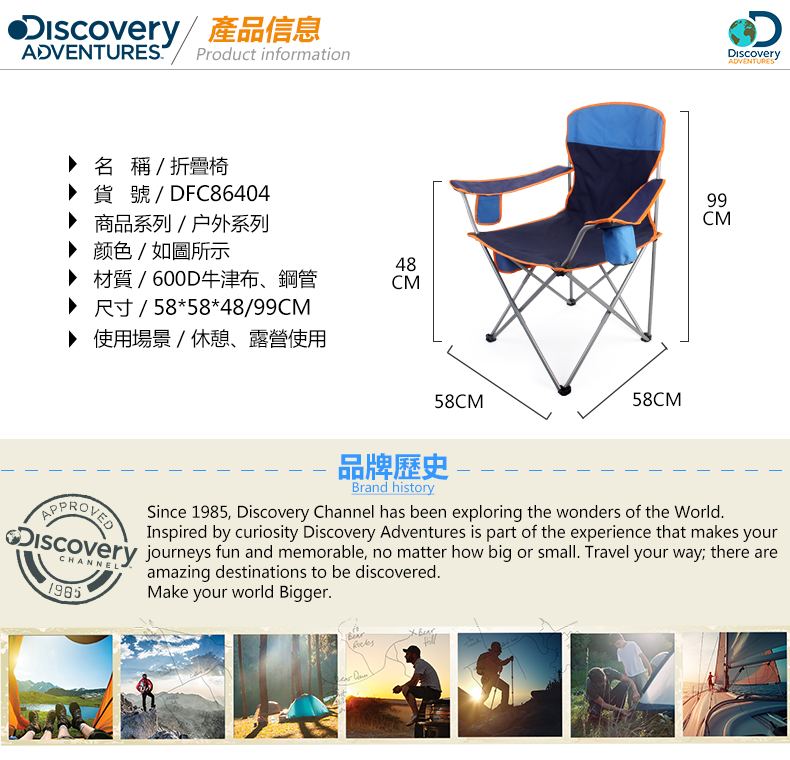 - 品名:多功能折疊椅 - 品牌:Discovery Adventures - 貨號:DFC86404 - 商品系列:戶外系列 - 顏色:藍色 - 材質:600D牛津布,鋼管 - 尺寸:58*58*48 / 99 CM - 最大承重量:約100 KG - 適用場合:休憩,露營使用