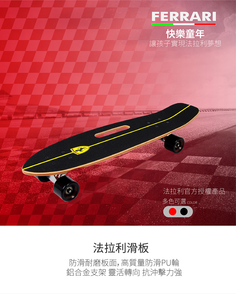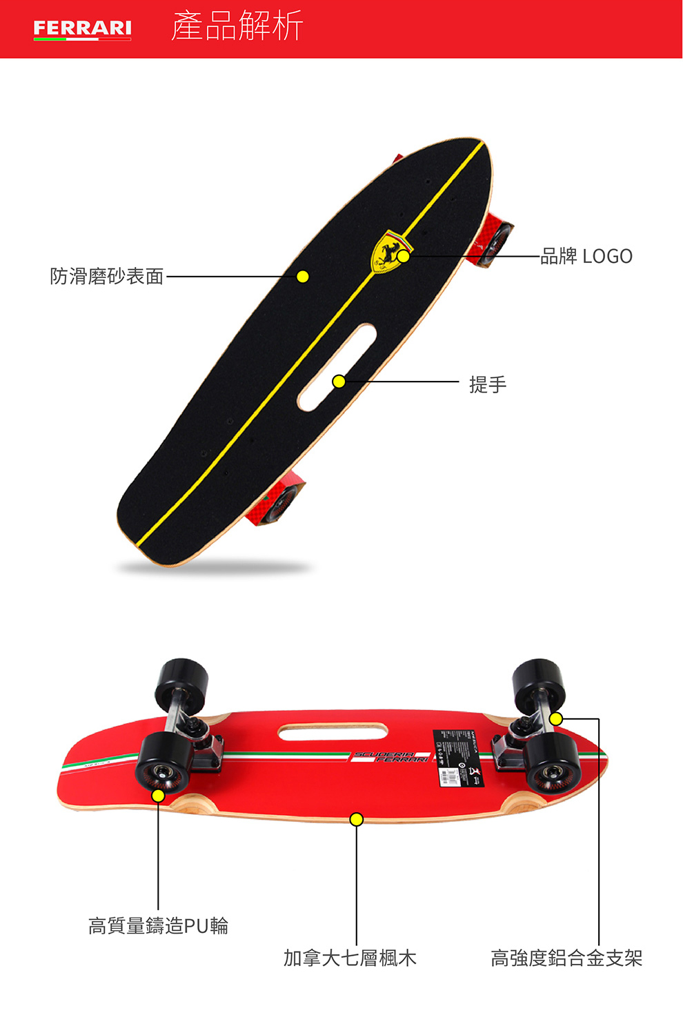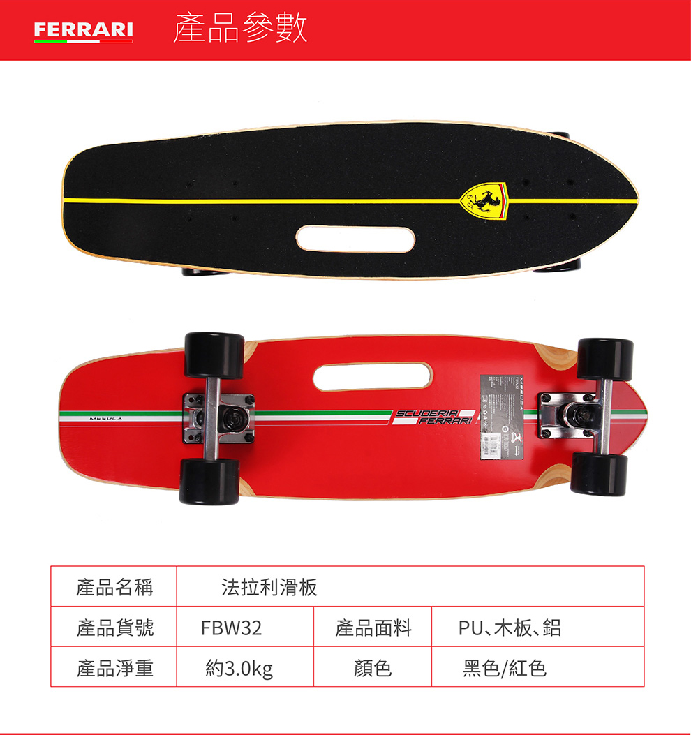 ◆ 品名: 巡洋艦滑板 ◆ 品牌: Ferrari 法拉利 ◆ 產品分類: 滑板 ◆ 產品貨號: FBW32 ◆ 產品顏色: 黑色 ◆ 產品材質: 金屬,塑料 / 板面材質:PP ◆ 輪子:高回彈聚氨酯輪 ◆ 軸承:ABEC-7