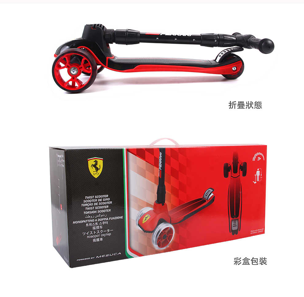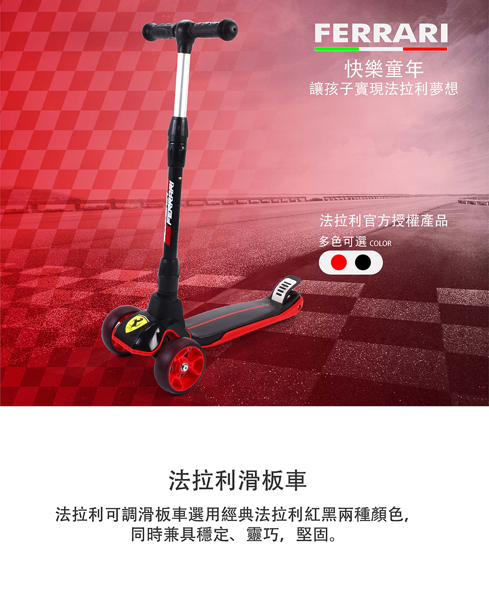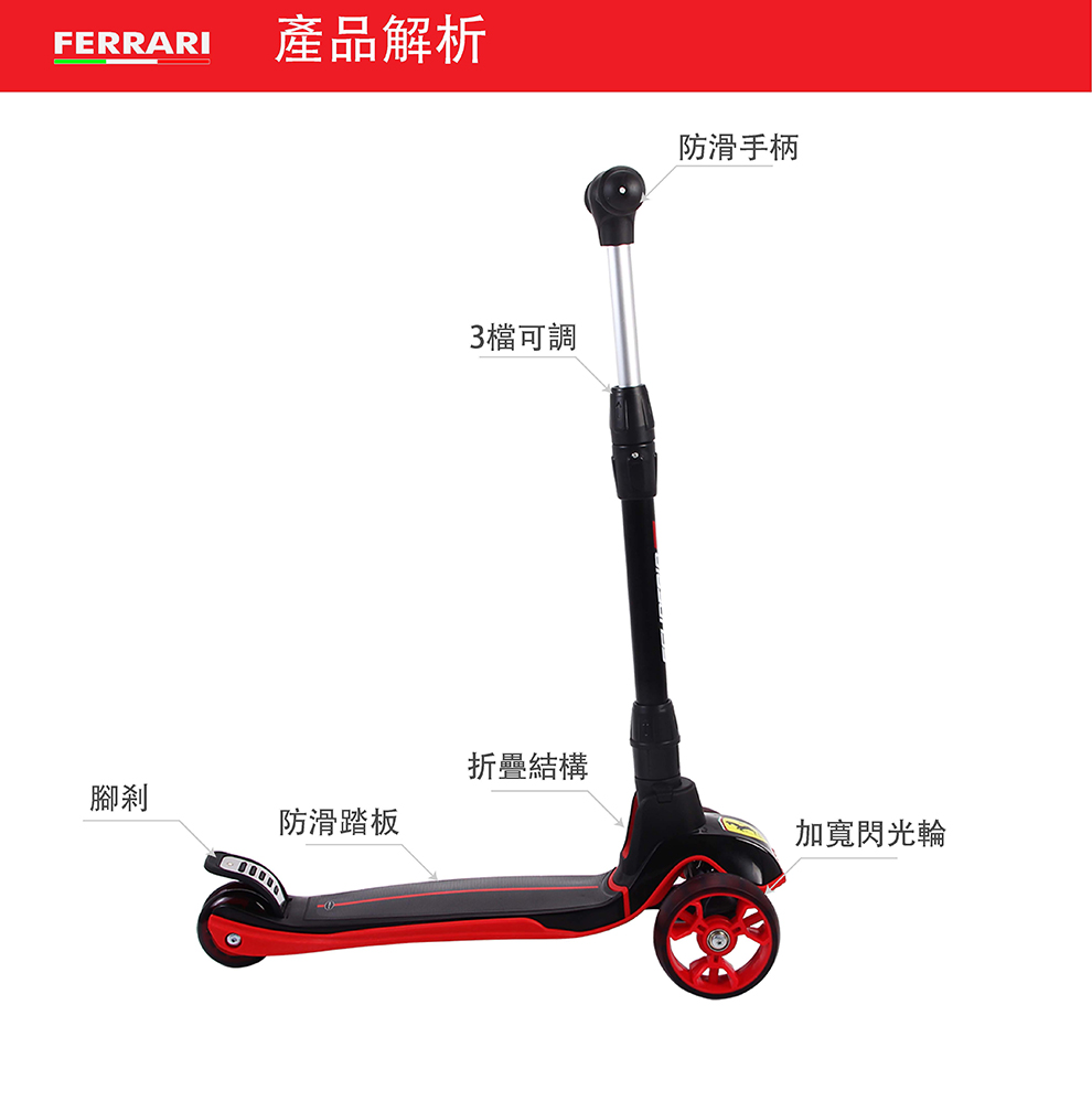 ◆ 品名: 折疊式滑板車 ◆ 品牌: Ferrari 法拉利 ◆ 產品分類: 滑板車 ◆ 產品貨號: FXK58 ◆ 產品顏色: 黑色/紅色 ◆ 高度調節: 66-77CM ◆ 產品材質: 金屬,塑料