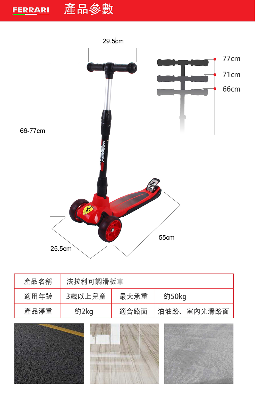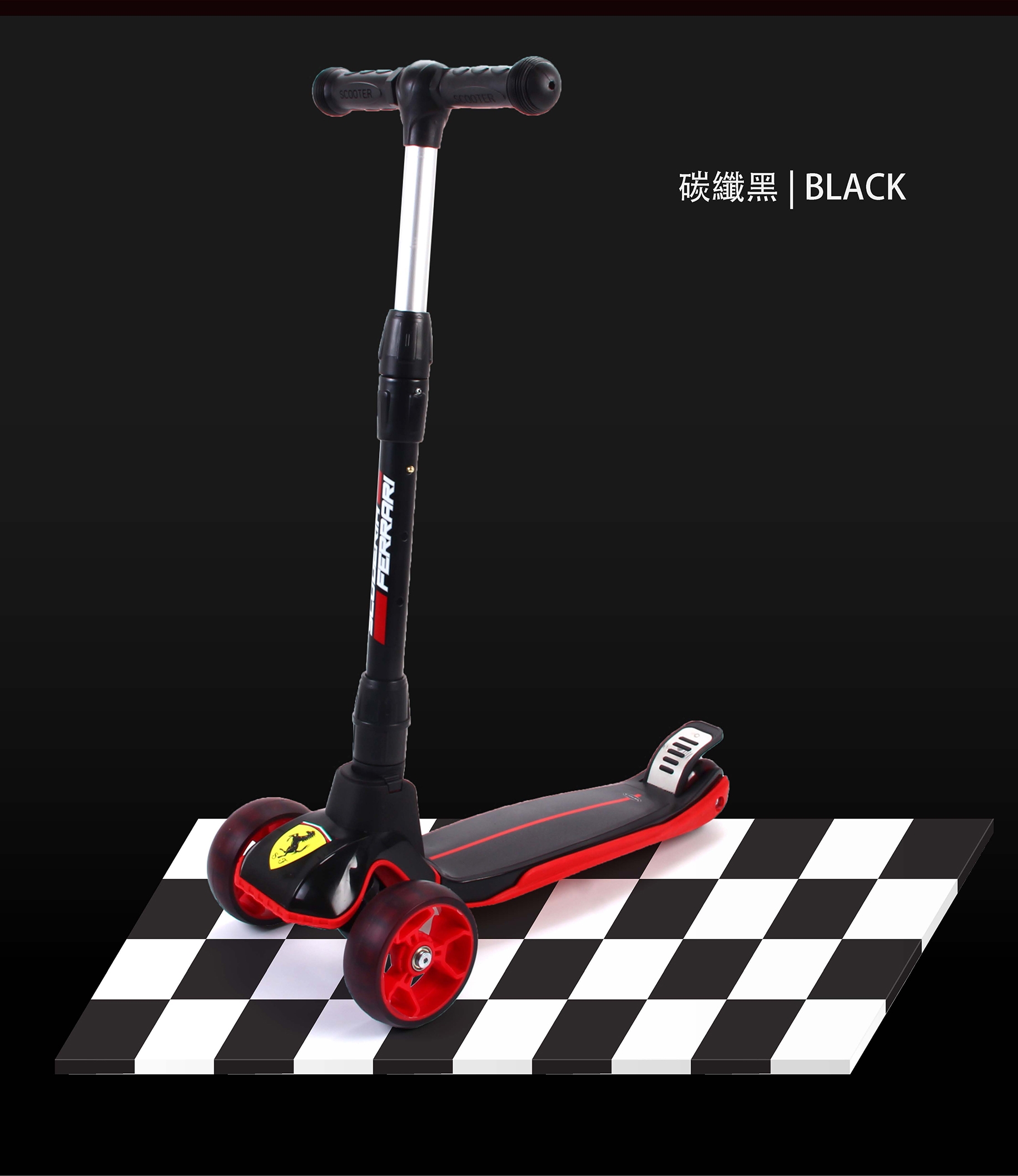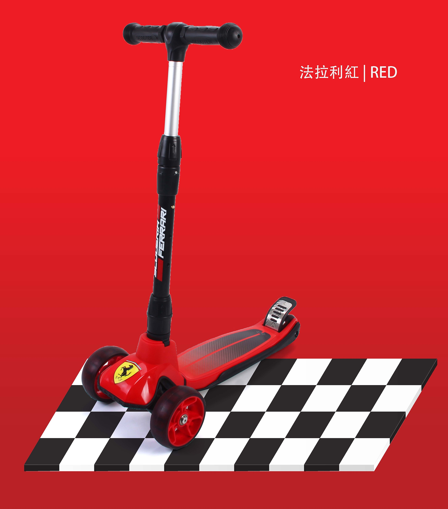 ◆ 品名: 折疊式滑板車 ◆ 品牌: Ferrari 法拉利 ◆ 產品分類: 滑板車 ◆ 產品貨號: FXK58 ◆ 產品顏色: 黑色/紅色 ◆ 高度調節: 66-77CM ◆ 產品材質: 金屬,塑料