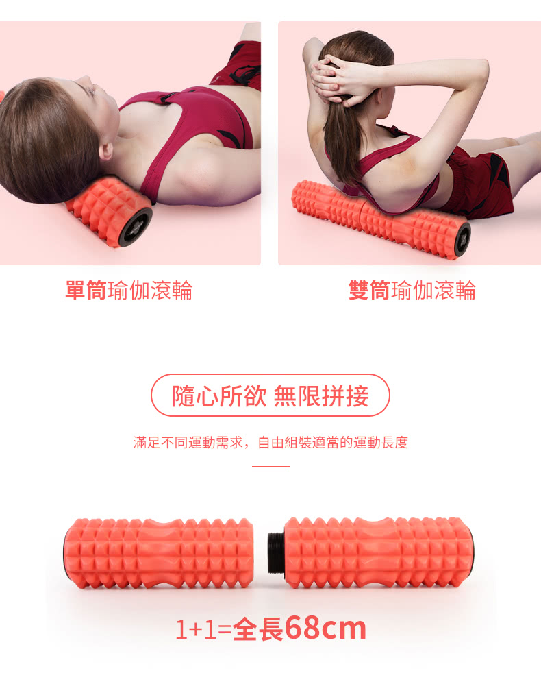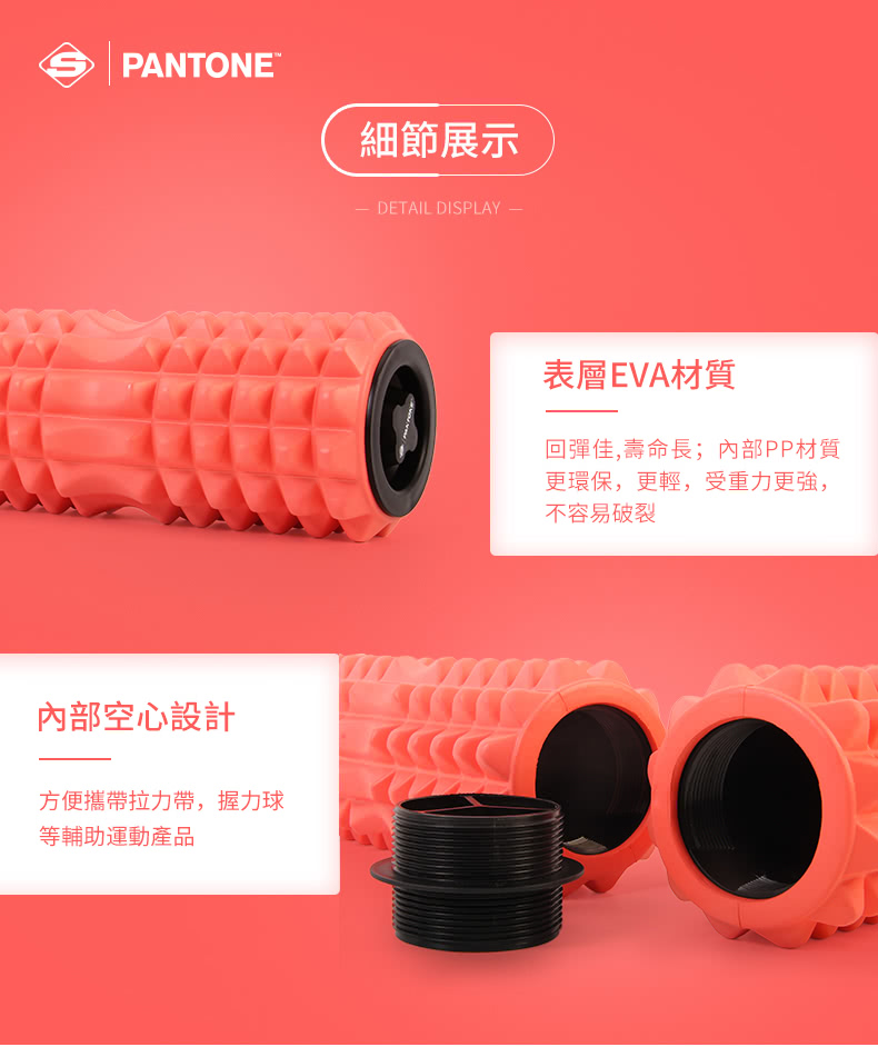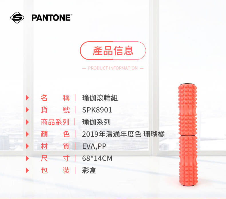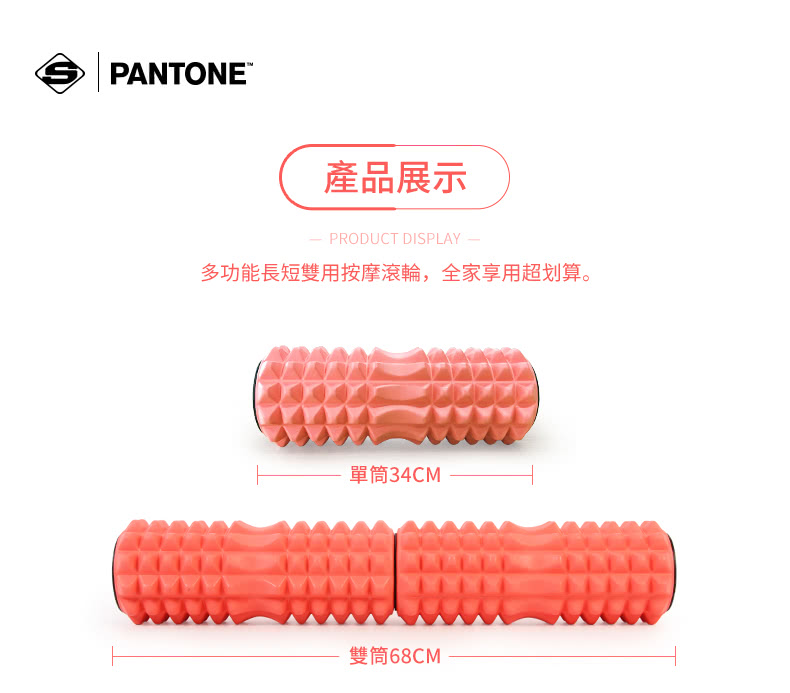 -品牌: PANTONE -品名: 瑜珈雙滾輪組 -型號: SPK8901 -材質: EVA , PP -產品尺寸:雙筒 : 約 68*14 CM / 單筒: 約 34*14 CM -顏色:珊瑚橘色 -製造產地: 中國