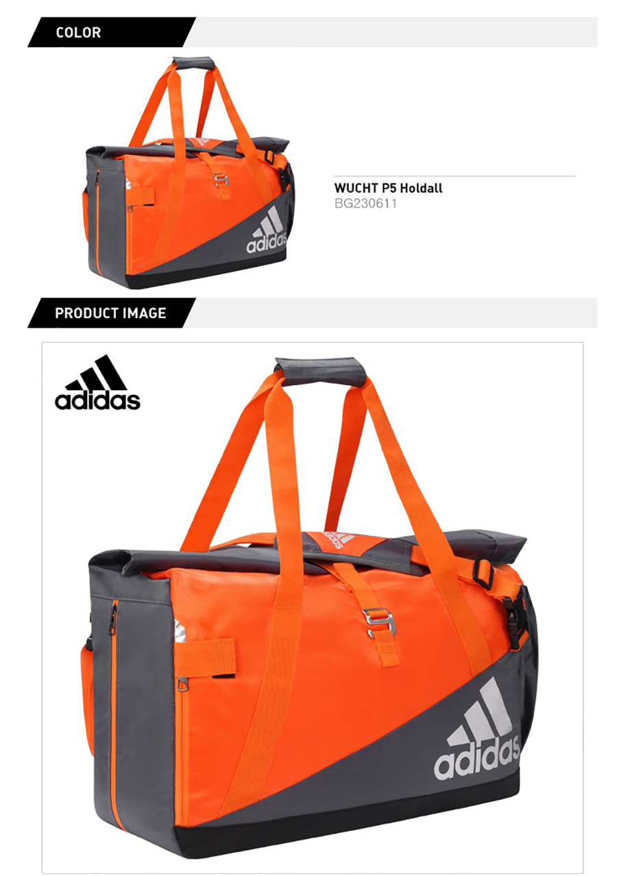產品型號:P5 HOLDALL - 品名:WUCHT P5 運動手提袋 - 成分:牛津提花布 - 品牌:ADIDAS 愛迪達 - 尺寸:53(L)*32(H)*22(W) CM - 產地:中國 功能: 1.球袋保溫層 2.球鞋存放袋 3.濕衣物存放袋 4.外部口袋