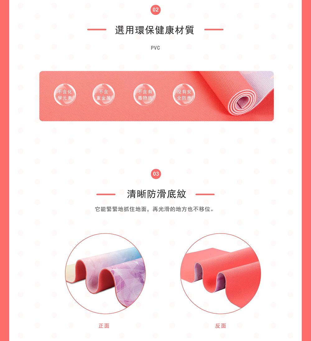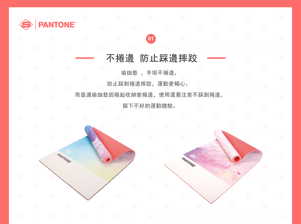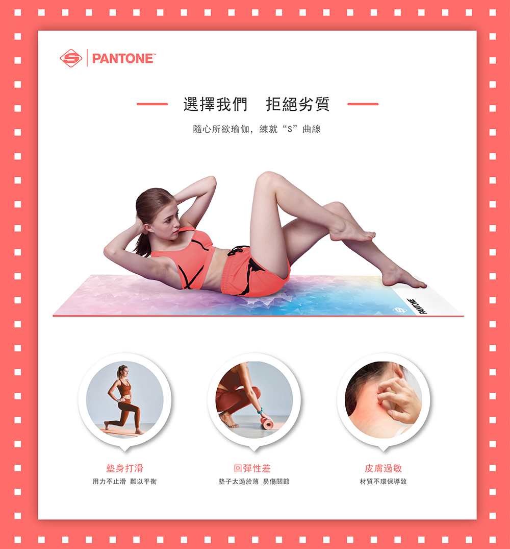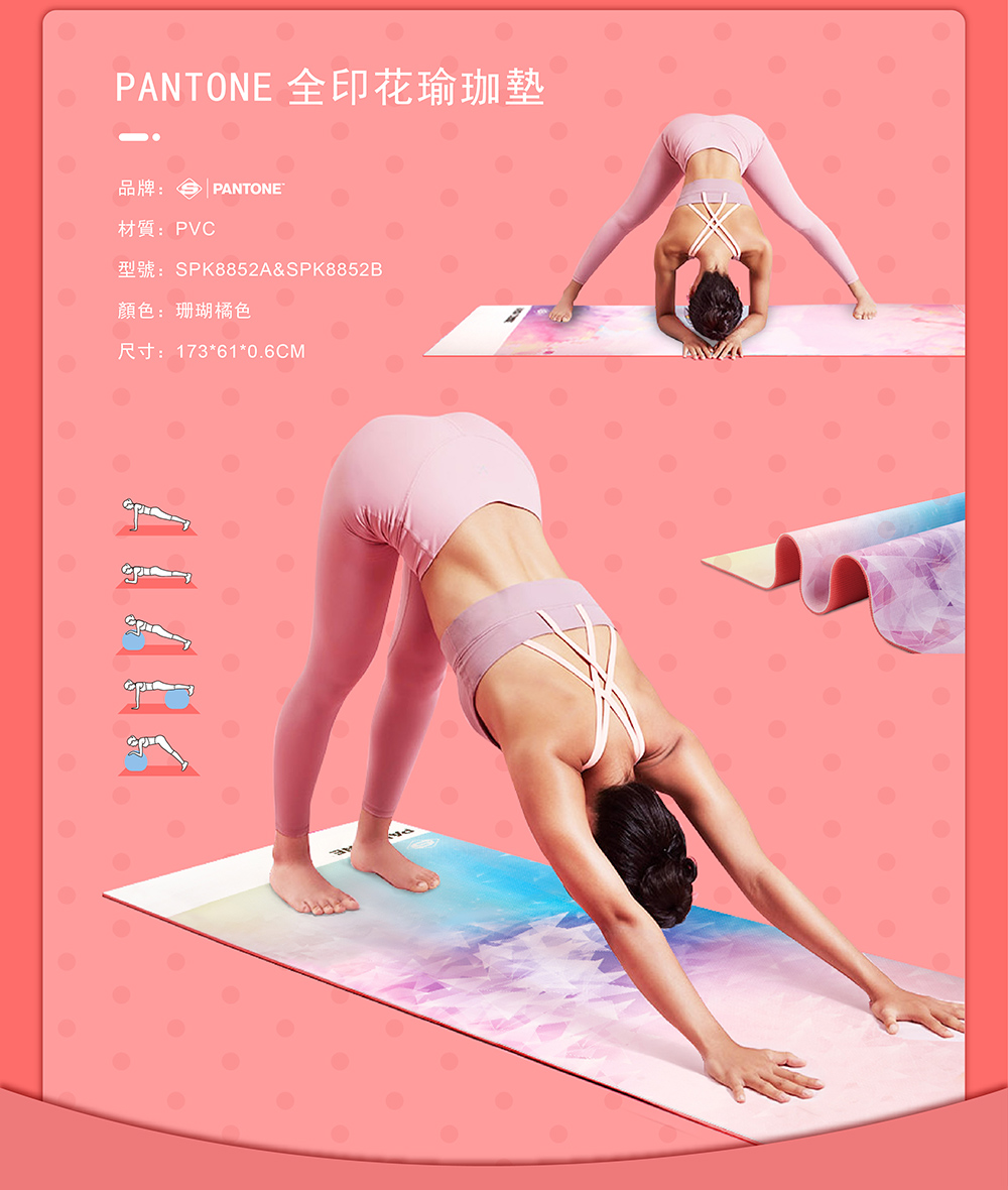 【 品 牌 】:PANTONE 【 品 名 】:瑜珈墊 【 厚 度 】:6mm 【 型 號 】:SPK88852A / SPK8852B 【 尺 寸 】:約173x61x0.6cm 【 材 質 】:PVC ※電腦螢幕會產生色差,顏色以實際產品為主。 ※商品尺寸及重量因測量方式不同,可能造成誤差,請以實際商品尺寸及重量為主。