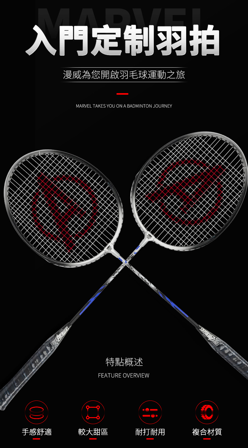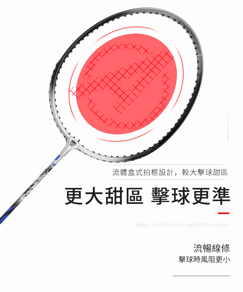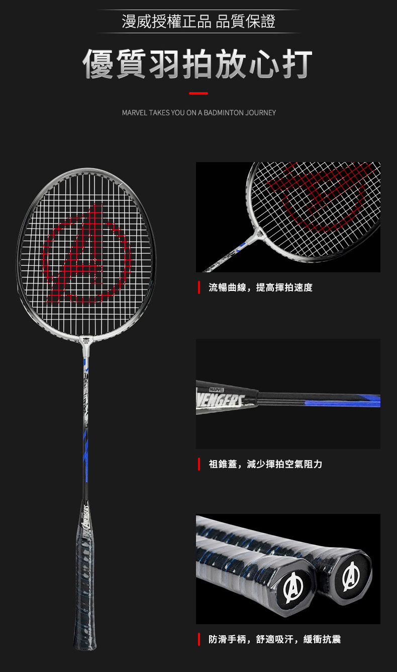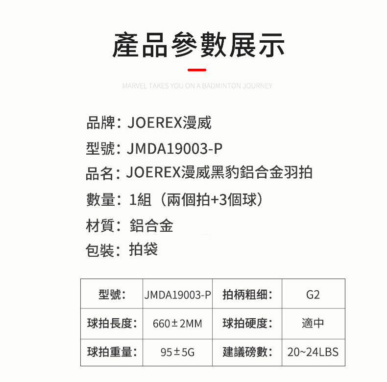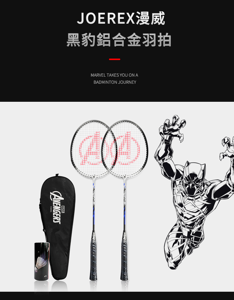 JOEREX X 漫威聯名款 鋁合金羽球拍 (內附:羽球拍*2 羽球*1 原廠拍袋*1) -型號:JMDA19003-P -品牌:JOEREX -重量:95+-5g -拍柄粗細:G2 -狀 況:新品 -材質:鋁合金 -產地:中國 -球拍長度:660+-2MM -中桿軟硬度:適中 -建議穿線磅數:20~24LBS