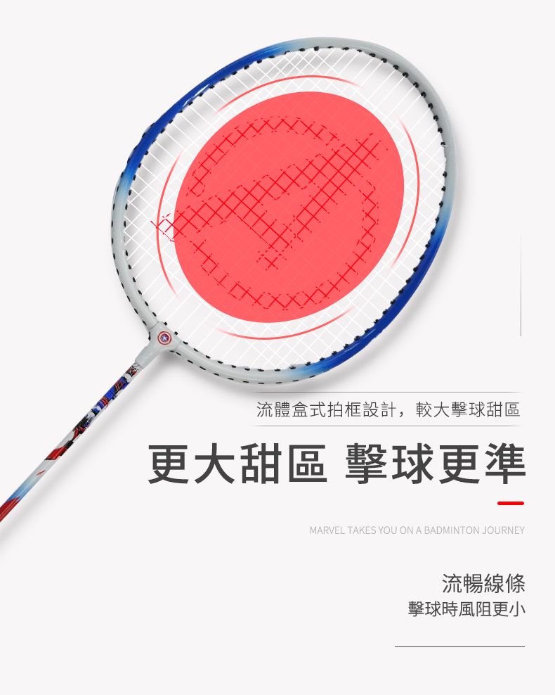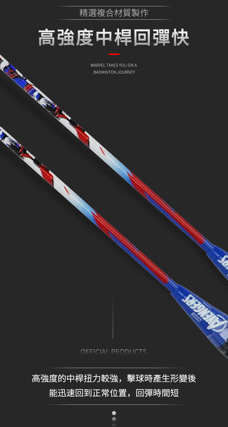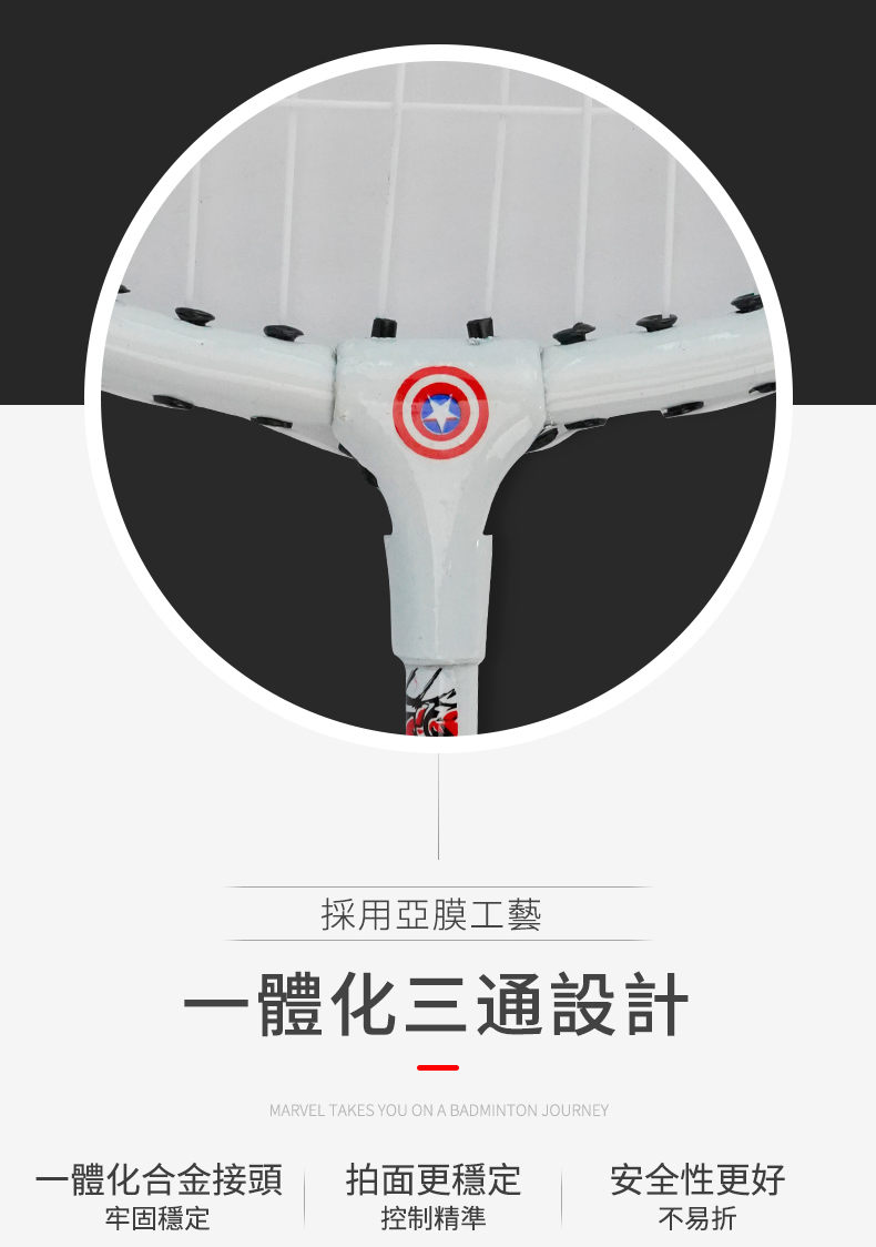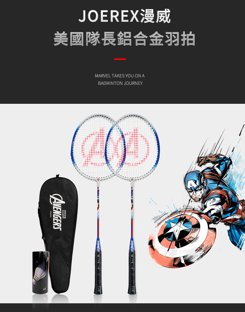 JOEREX X 漫威聯名款 鋁合金羽球拍 (內附:羽球拍*2 羽球*1 原廠拍袋*1) -型號:JMDA19003-T -品牌:JOEREX -重量:95+-5g -拍柄粗細:G2 -狀 況:新品 -材質:鋁合金 -產地:中國 -球拍長度:660+-2MM -中桿軟硬度:適中 -建議穿線磅數:20~24LBS