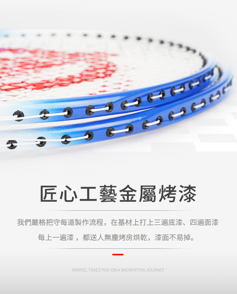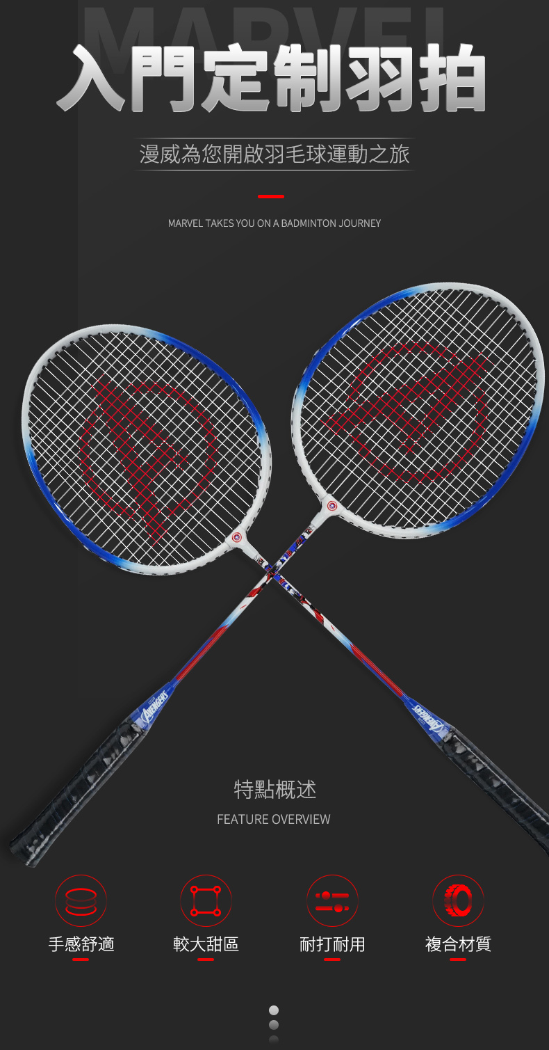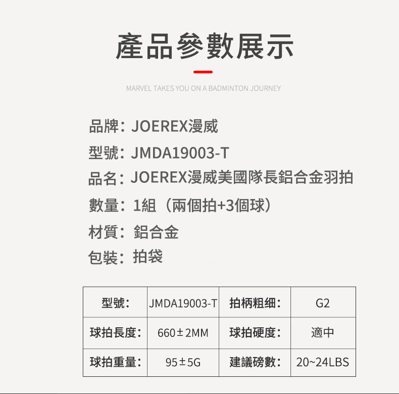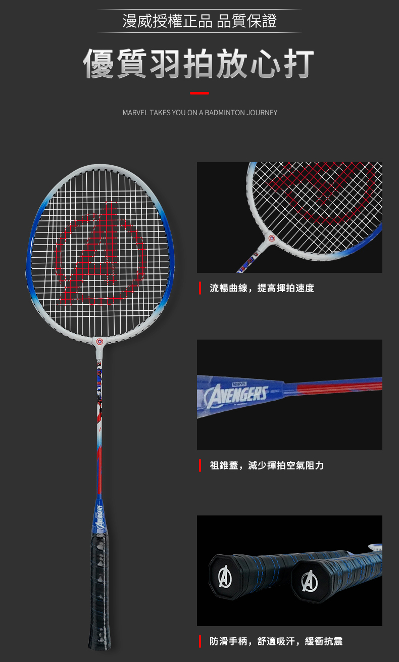 JOEREX X 漫威聯名款 鋁合金羽球拍 (內附:羽球拍*2 羽球*1 原廠拍袋*1) -型號:JMDA19003-T -品牌:JOEREX -重量:95+-5g -拍柄粗細:G2 -狀 況:新品 -材質:鋁合金 -產地:中國 -球拍長度:660+-2MM -中桿軟硬度:適中 -建議穿線磅數:20~24LBS