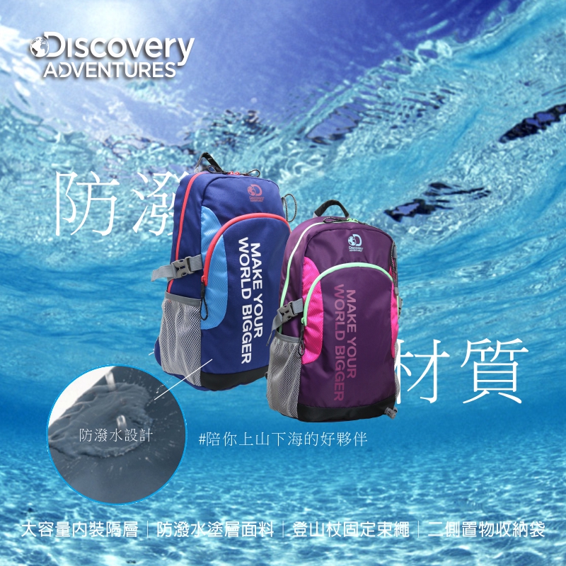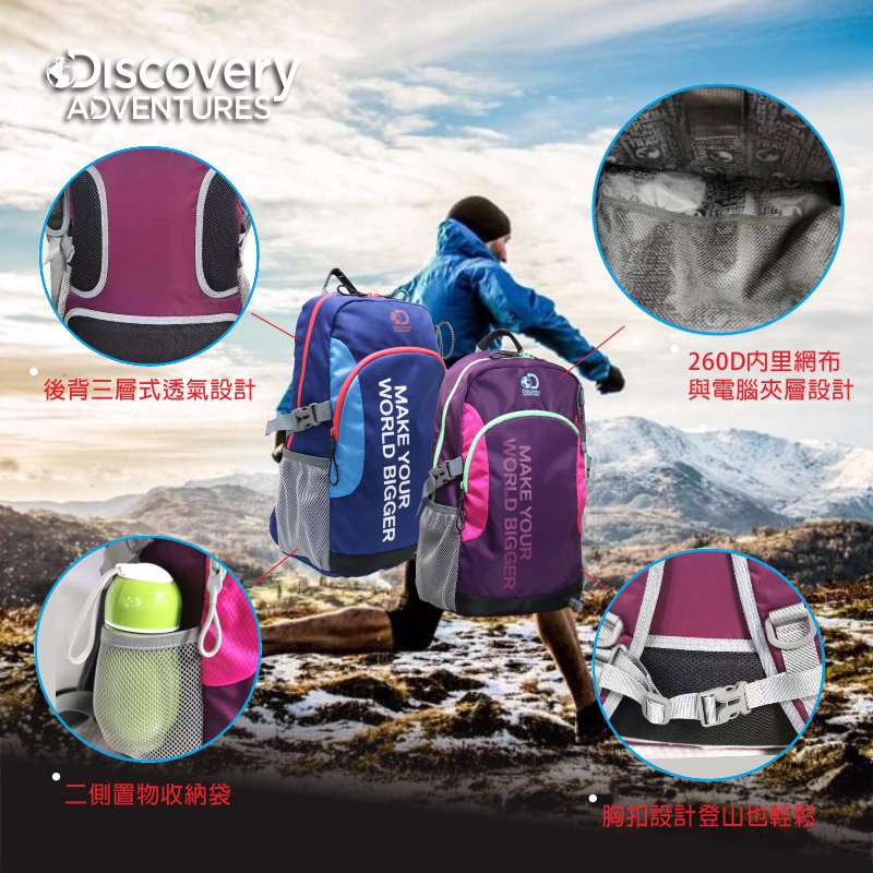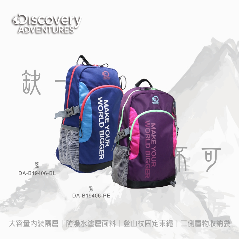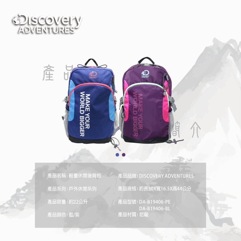 - 品牌:Discovery Adventures - 品名:輕量休閒後背包 - 商品系列:戶外休閒系列 - 產品貨號:DA-B19406-PE / DA-B19406-BL - 顏色:藍色/紫色 - 材質:尼龍 - 尺寸:約 30*16.5*44 cm - 容量:約22公升