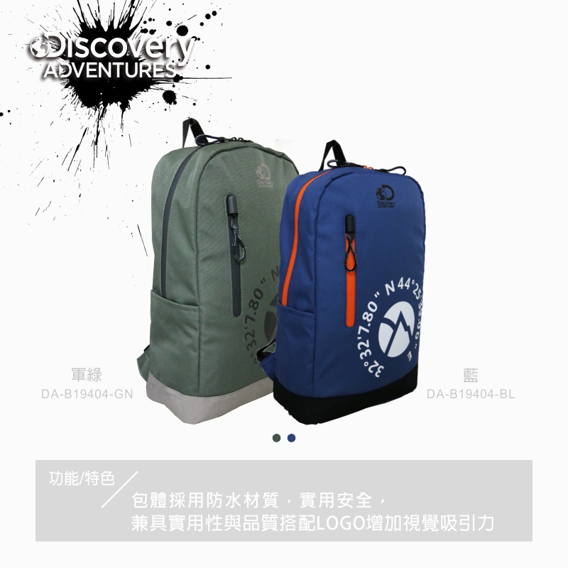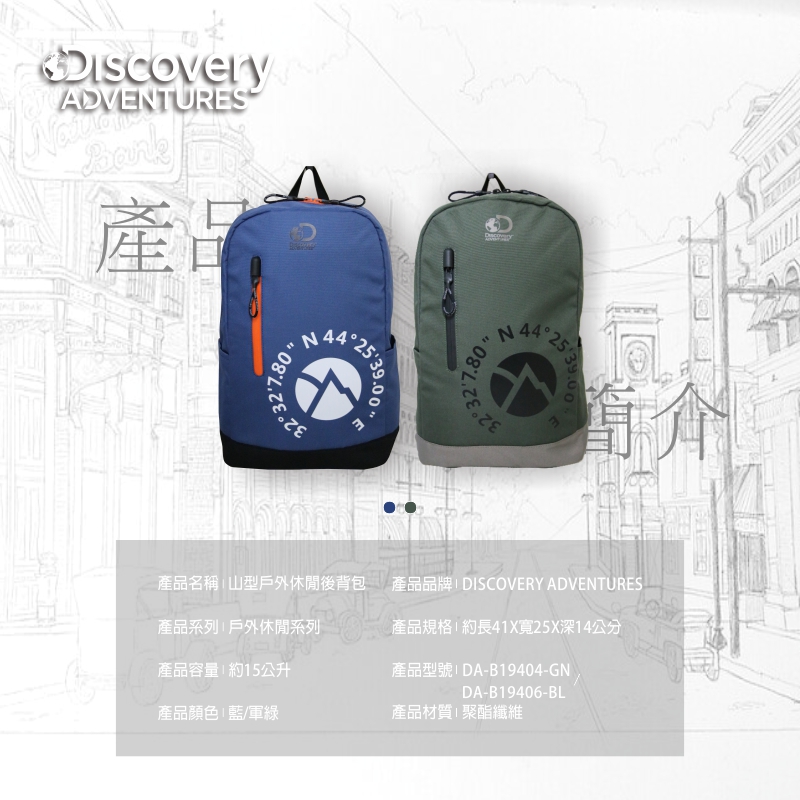 - 品牌:Discovery Adventures - 品名:探索休閒後背包 - 商品系列:戶外休閒系列 - 產品貨號:DA-B19404-GN / DA-B19404-BL - 顏色:藍色/軍綠色 - 材質:聚酯纖維 - 尺寸:約 41*25*14cm - 容量:約 15公升