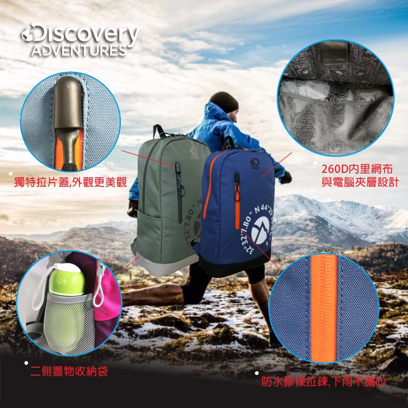 - 品牌:Discovery Adventures - 品名:探索休閒後背包 - 商品系列:戶外休閒系列 - 產品貨號:DA-B19404-GN / DA-B19404-BL - 顏色:藍色/軍綠色 - 材質:聚酯纖維 - 尺寸:約 41*25*14cm - 容量:約 15公升