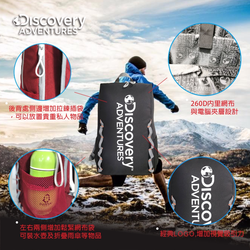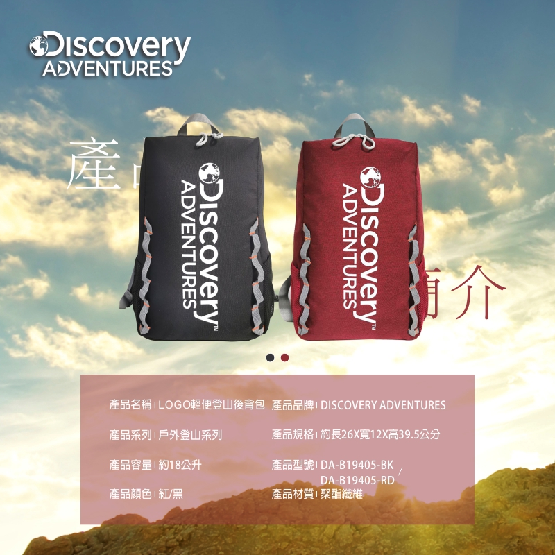- 品牌:Discovery Adventures - 品名:輕便登山後背包 - 商品系列:戶外登山系列 - 產品貨號:DA-B19405-BK / DA-B19405-RD - 顏色:紅色/黑色 - 材質:聚酯纖維 - 尺寸:約 26*12*39.5cm - 容量:約 18公升
