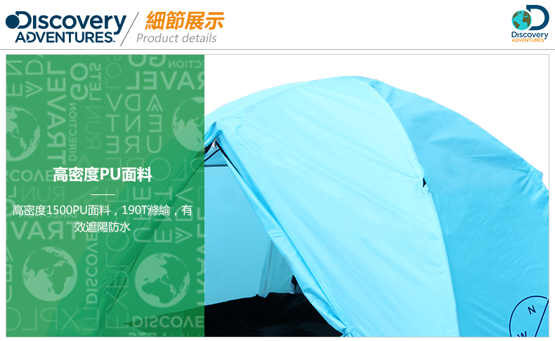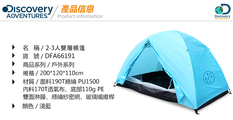 - 品名:2-3人 單層帳篷 - 貨號:DFA66191 - 品牌:DISCOVERY ADVENTURES - 材質:面料190T聚酯纖維,PU1500塗層/170T透氣布,底防水布110G pe雙面淋膜/M2雙側PE,滌綸紗密網,玻璃纖維桿 - 尺寸:200*120*110 cm - 產地:中國 ※電腦螢幕會產生色差,顏色以實際產品為主。 ※商品尺寸及重量因測量方式不同,可能造成誤差,請以實際商品尺寸及重量為主。